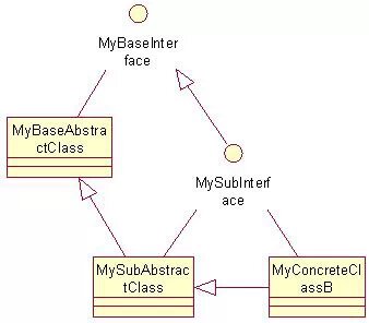 MyInterface-->MyAbstractClass-->MyConcreteClassB.这是图(1)的一边,当MyConcreteClassB类需要扩展新方法,而不仅仅局限于MyInterface接口定义的方法呢?首先想到的当然是,让MyConcreteClassB同时实现另一个具有新方法的接口。考虑到新接口在集合类中也是一种MyInterface接口,所以,这个新接口继承了MyInterface。同时,对于新接口也需要缺省的或公共的方法,所以,把MyConcreteClassB改装为抽象类,最后,让最终的具体去继承该抽象类以及实现新接口。变成了上面的图。当然,这只是一个基本图。如果,你不一样的需求,完全可以改装你想要的结构。但是,这样的结构,相信维护起来很好。