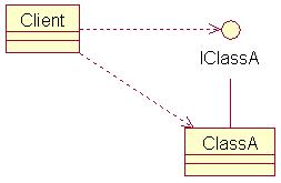 比如,为了处理字符串,你会new String,然后进行一些处理。甚至,你的代码里到处都充砌着String的足迹,这样确实能很好的解决问题。这样的结构背后的理由呢?首先,我想说的是,这样的结构违反了DIP原则,细节应该依赖于抽象,而不是依赖于另一个细节。这样的依赖关系会使代码缺乏弹性,很难复用,迁一发动全身。应该改进的是,把ClassA的抽象提取出来,然后让client去依赖于IClassA,变成如下图: